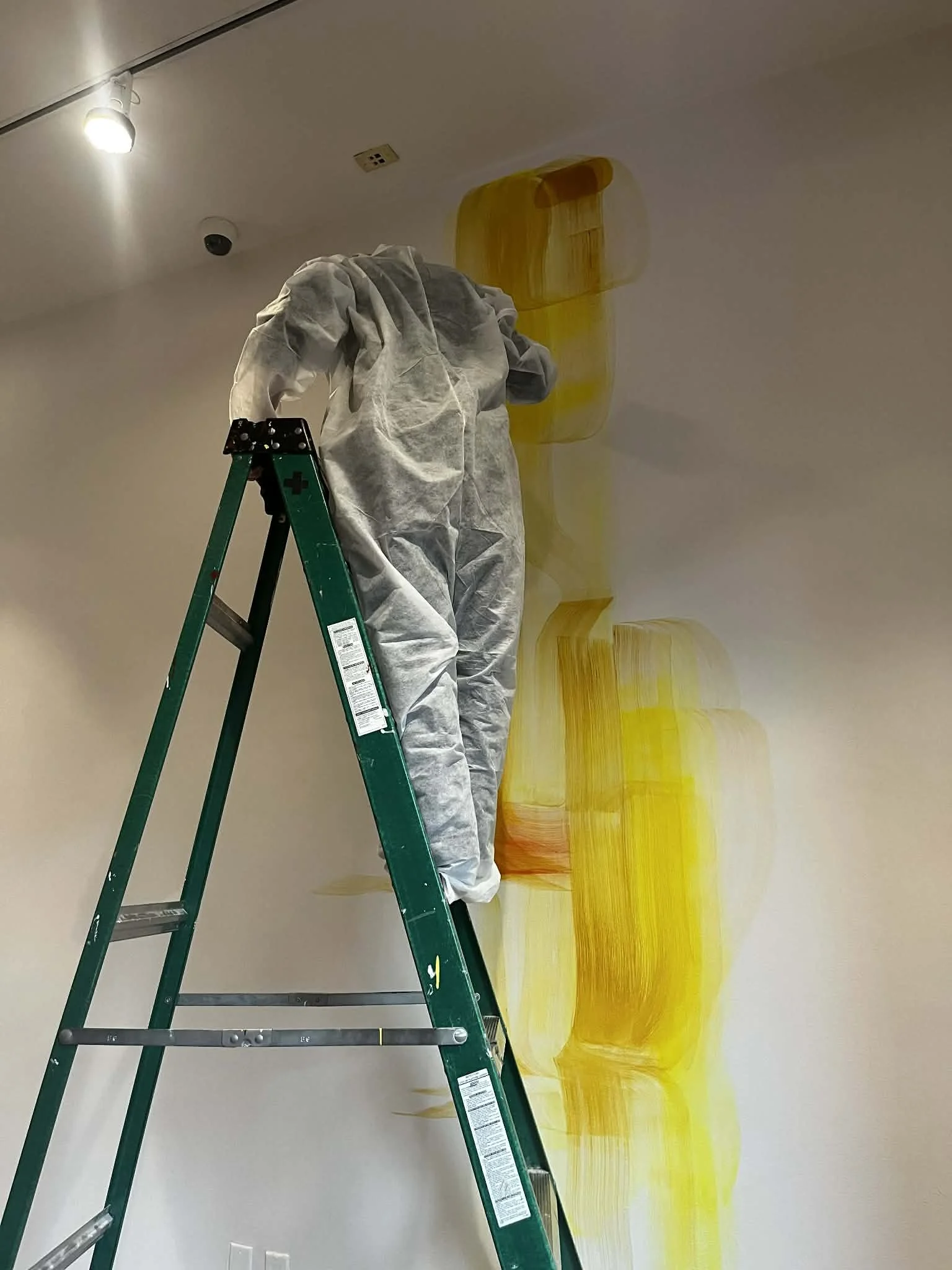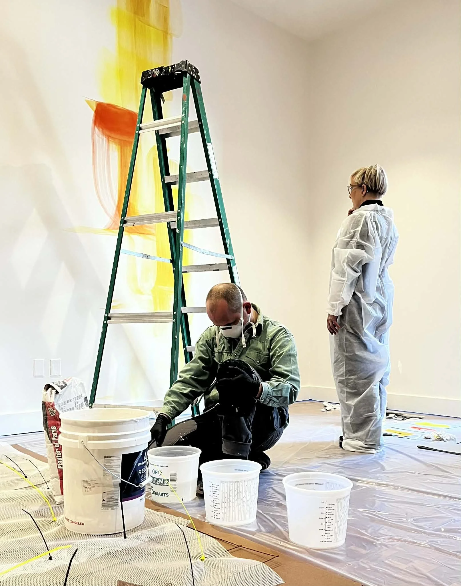 Hans palet er som et eventyr af et flerfarvet bjerglandskab af maling på en stålvogn med hjul, som kunstneren kan flytte efter behov. Det ser rodet ud, men der er orden i tingene og i farveblandingen – man kan se, hvordan de små og større bunker maling langsomt skifter farve i forskellige blandinger på paletten. Mellem de farverige bjerge og dale står forskellige krukker og dåser, som med tiden vokser fast og bliver en del af det farverige landskab.
