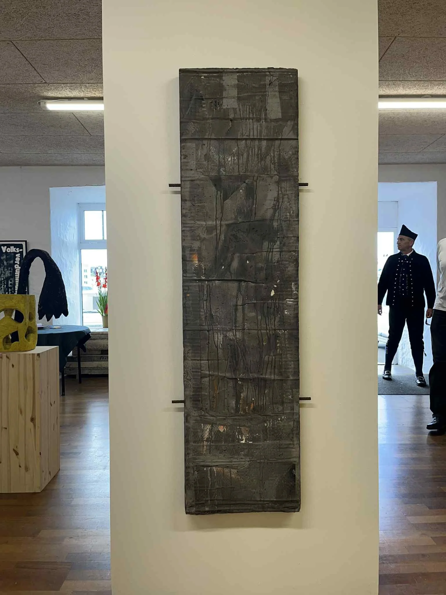 Tað tilfarsliga hevur stóran týdning hjá Jóhan Martini Christiansen, sum í mong ár hevur arbeitt við gips. Gipsrelieffini verða stoypt á pappstykkjum, sum listamaðurin hevur valt sum grundformar. Í prosessini verður eitt tilfar sostatt yvirført til eitt annað. Yvirflatin minnir um papp, men er gips. Gips ella kalciumsulfat er eitt náttúrligt hvítt mineral, sum vit kenna t.d. frá gipsavstoypingum av standmyndum. Gipsverkini hesaferð eru kolasvørt og henda koloristiska umbroytingin hevur stórt árin á verkini, ið gerast eins og ein døkkur portalur inn í myrka partin av framsýningini.