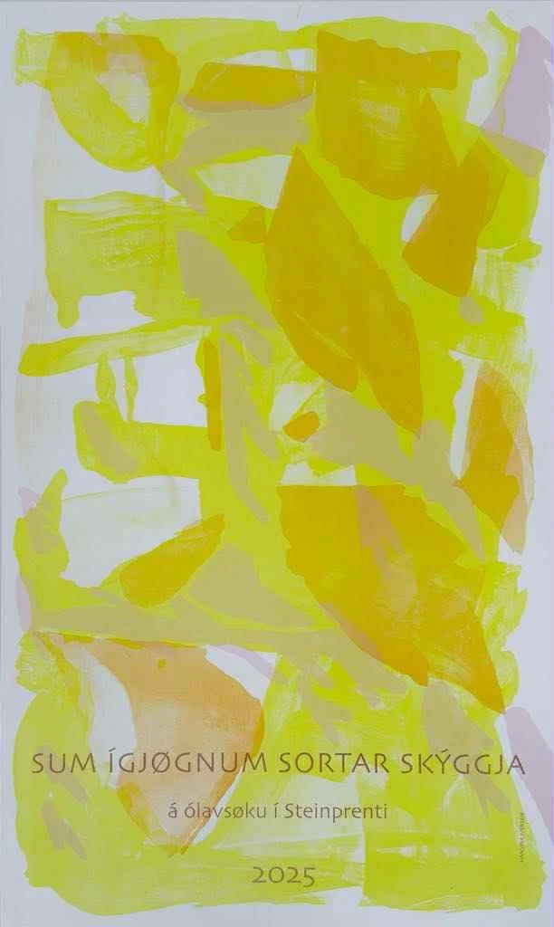 Framsýningin SUM ÍGJØGNUM SORTAR SKÝGGJA letur upp í Steinprenti sunnudagin 27.juli klokkan 16-18 og er opin um ólavsøkuna. Hjartaliga vælkomin. Kinna Poulsen, sum nýliga hevur givið út samtíðarlistabókina Í eygnahædd (Sprotin), hevur kuraterað framsýningina.