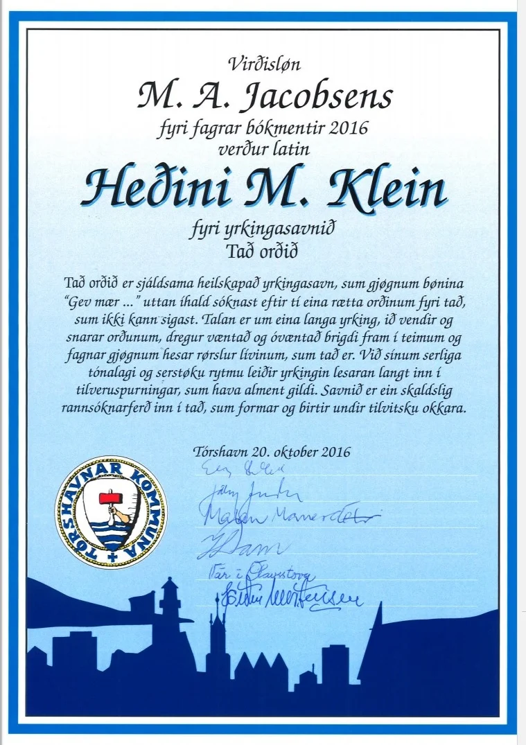 Heðin M. Klein fekk M.A.Jacobsens virðislønina fyri fagrar bókmentir