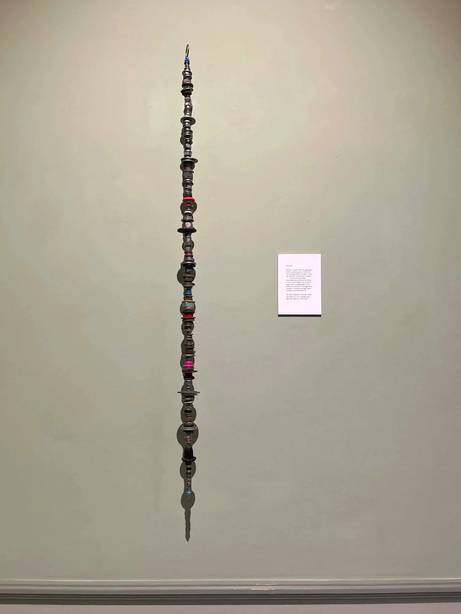 Einastaðni hongur eitt vakurt avlangt verk, ið ber brá av at vera týdningarmikið og líkist einum mikið tignarligum kongsstavi av onkrum slag inntil tú varnast, at hann er settur saman av møtrikkum í skiftandi stødd og skapi. Á skeltinum stendur, at listamaðurin hevur funnið tilfarið ymsastaðni á gøtuni frá 1.januar í 23 og eitt ár fram. Verkheitið sipar til norrøna fyribrigdið, prímstafr; eitt slag av kalendarastavi, sum var brúktur at halda skil á tíðini. Hetta er eitt merkiliga rørandi verk, sum við sínum vakurleika, eyðmjúka tilfari og arkeologiska hjálparloysi gerst ein ímynd av sjálvari tilveruni, sum óansæð hvussu nógvar álmanakkar og aðrar talskipanir vit finna uppá, er stokkut, skroypilig og avmarkað. Tó at Somnambulus á so mangan hátt við kørmum og lutum sipar til fortíð, er talan um eina viðkomandi samtíðarlistaframsýning, sum við sínum (europeiska) mentanarsøguliga innliti og listaliga gløggskygni er í tiltrongdari andstøðu til søgu- og samvitskuleys rák í okkara tíð. Eg kundi ynskt mær at sæð og lisið hesa generøsu framsýningina fleiri ferðir, men hon endar skjótt; 14.desember!