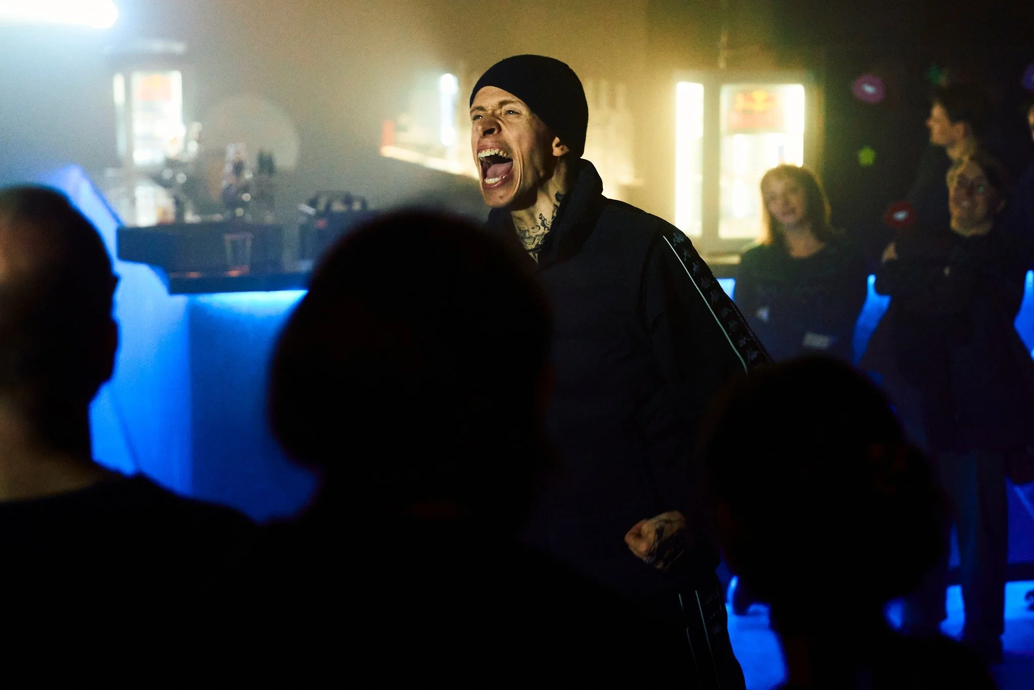 Devising er sum nevnt ein kollektivur arbeiðsháttur, sum í hesum føri er stýrdur og skipaður av royndum leiklistafólki á Tjóðpalli Føroya eins og scenografi, búnar, ljós, ljós osfr er í Tjóðpallsregi. Fleiri leikir bæði har og aðrastaðni hava seinastu árini tikið støði í teimum ungu og tað er tiltrongt. Eg vænti, at ein leikur sum Skeivur kann vekja áhuga fyri leiklist bæði millum ungar leikarar og áskoðarar og tað er í sjálvum sær framúr - vónandi fer tað eisini at dryppa á deknin eisini útbúgvingarliga. Uttan at avdúka ov nógv – tí hetta er ein leikur, sum skal sleppa at taka áskoðaran á bóli - kann eg stutt tríva í søgugongdina, har vit hitta nakrar ungar persónar; ið verða leiktir av Mariusi Dam Christophersen, Haraldi Egholm, Lív Bruun Müller, Kelvin Origen Mathayo og Óluvu Heidiardóttir Tvørfoss – fleiri av teimum ungu havi eg ikki sæð á leikpalli áður og tað er sum heild merkisvert avrik av leikum og lærdum ikki minst Marius Dam Christophersen, sum debuterar í einum stórum leikluti. Hann spælir Mark, hvørs uppvøkstur hevur verið merktur av harðskapi og vantandi umsorgan. Hann hevur ilt við at stýra sær og sínum kenslum og hevur tí tikið eina stóra avgerð um at stinga í sekkin, fara til Danmarkar fyri at melda seg í herin. Byrjanin uppá lívsbroytingina skal henda longu hetta kvøldið í býnum, tá Mark ætlar at halda seg edrúan, men hetta vísir seg at vera ein stór avbjóðing. Hesin leikluturin er avbjóðandi og sum heild trúgva vit uppá ólukkuliga unga menniskjað, sum ikki megnar at liva harmoniskt og ærligt, kanska tí hann, sum vinmaðurin seinni nevnir í eini bøn, hevur manglað kærleika. Onkra løtu ivist eg eitt sindur kanska av tí, at leikarin frammanundan hevur eitt slag av pall-persona sum Marius DC; ein dugnaligur og framligur rappsangari/framleiðari, hvørs tekstir eru lutfalsliga outspoken, men mann tekur hjartaliga synd í honum ikki minst tá teir somu vinirnir, sum vildu hava hann at drekka, seinni finnast at honum fyri óhóskandi atburð. Í leikinum verða eisini søgurnar hjá vinfólkunum sagdar, so at mann uppá skift flennur og tekur synd í teimum - eisini í vaksna, fulla manninum, sum er vilstur inn í Luux (nú konan var farin til ost- og vínhugna saman við bindiklubbavinkonunum) – hann verður mikið andstyggiliga portretteraður av Hjálmari Dam, sum kortini móti endanum megnar at venda óhugna og speisemi til okkurt slag av menniskjaleika í einari alt ov lítlari XXXL t-shirt.