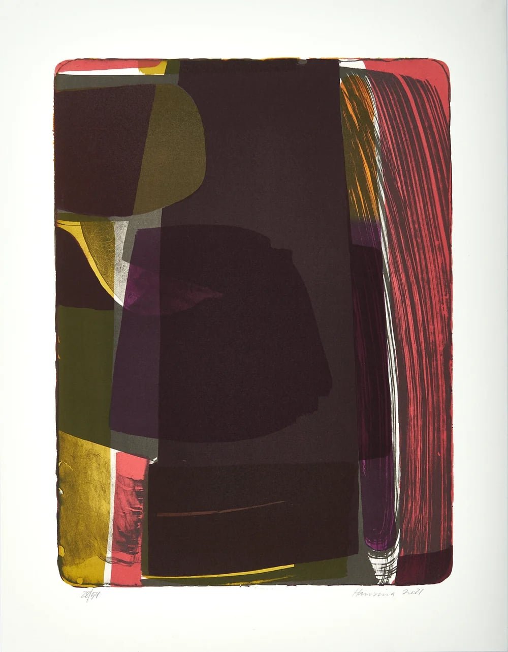 Kanska er tað meira munur enn líkheit, sum kemur tær til hugs, um tú samanber stóru messuna hjá Anton Bruckner frá 1868 við lítla steinprentið hjá Hansinu Iversen frá 2021, sum er endurgivið á konsertskránni. Men hetta er væl at merkja bara so leingi sum tú enn ikki hevur tendrað móttakaran í heilanum, sum í mynstrum av litum og tónum støðugt kennir aftur, finnur samanhangir og knýtir hugasambond millum ótálmaðar kenslur og listarligt tamarhald. Prentmyndin er at síggja til lutfalsliga myrk og tung við hópin av skapum og litum, ið tykjast pressað niður í tað avmarkaða og kompakta myndarúmið, har tey eru við at spreingja myndaflatan. Dimmbrún skap daga undan bæði ovarlaga og niðarlaga í kompositiónini, ið er er sett saman av fleirlittum formum og strokum, sum í skiftum leggja seg inn undir og út yvir onnur litløg. Fótafarið av penslastrokum setir ferð á – tað er eins og alt møguligt gongur fyri seg aftanfyri í myndarúminum, ið tó verður stabiliserað av einum stórum avlongum skapi, sum úr erva strekkir seg niður yvir myndina og býtir hana í tríggjar lodrættar høvuðsformar. Myndin er abstrakt og tríbýtti bygnaðurin kann fevna um eina og hvørja søgu, sum hevur eina byrjan, eina miðju og ein enda, men trítalið hevur eyðvitað serligan týdning innan kristindómin við tríeindini, teimum trimum krossunum á Golgata, Jesu uppreisn á triðja degi osfr. Í myndini hjá Hansinu eru søgurnar ikki ítøkiligar, men dramaið er tað sama; kompleksi monumentaliteturin og bygnaðurin, sum smalkar uppeftir eins og leitar myndin til himmals. Tá tú hevur hugt eina løtu og eyguni hava vant seg við monumentala myrkrið í myndini, varnast tú hvussu litrík hon er og hvussu violetta heildin fær sublimt aftursvar frá einum darrandi gulum tóna.